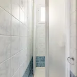 Bathroom facilities also include a walk-in shower and a separate toilet. There are a hairdryer and towels for guests' comfort.